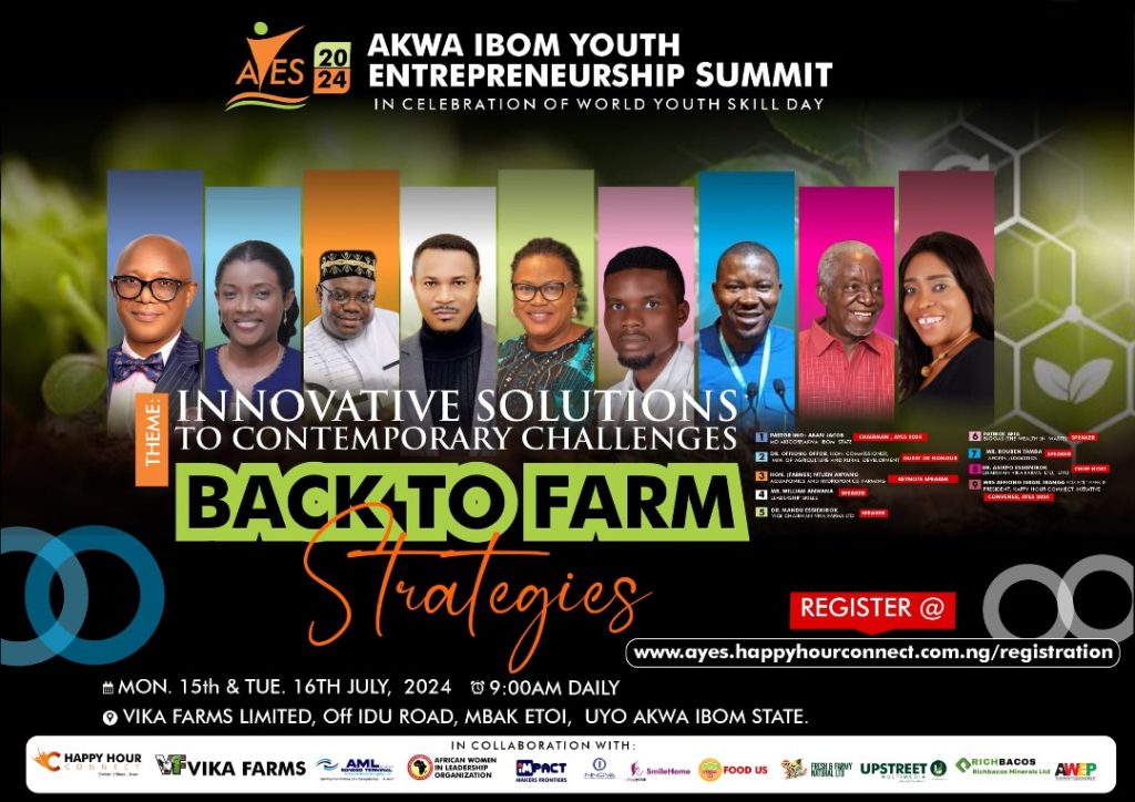 The Akwa Ibom Youth Entrepreneurs Summit (AYES 2024) brought together aspiring and established young entrepreneurs in Uyo, Akwa Ibom State, on July 15th and 16th, 2024. Held at Vika Farms Limited in Mbak Etoi, the summit, themed "Innovative Solutions to Contemporary Challenges: Back to Farm Strategies," provided a platform for insightful discussions, networking opportunities, and practical skills development. Sponsored by the Happy Hour Connect Initiative, AYES 2024 aimed to inspire and empower the youth to embrace agribusiness and contribute to the economic growth of the state.